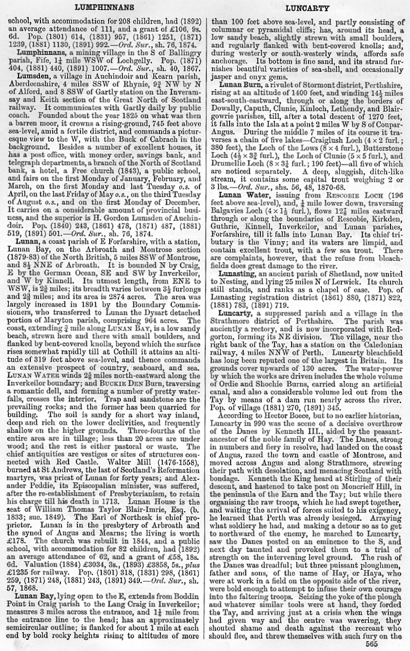 Lumphinnans, Lumsden, Lunan, Lunan Bay, Lunan Burn, Lunan Water, Lunasting, Luncarty