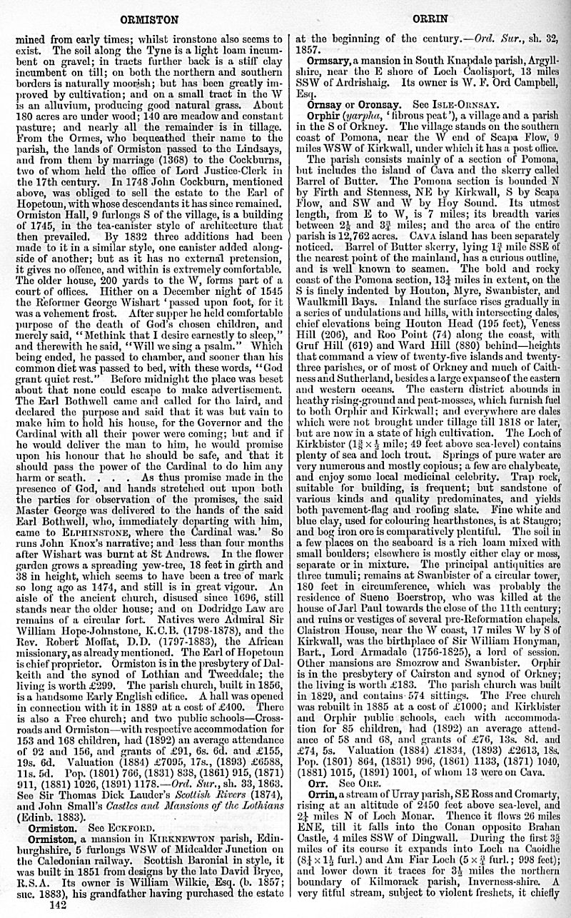 Ormiston, Ormsary, Ornsay or Oronsay, Orphir, Orr, Orrin