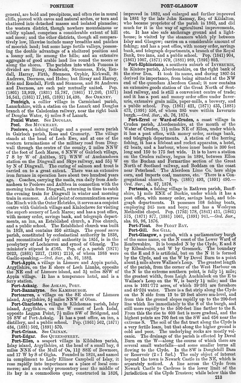Ponfeigh, Poniel Water, Pool, Poolewe, Port-Appin, Port-Askaig, Port-Bannatyne, Portcarren, Port-Charlotte, Port-Crinan, Port-Edgar, Port-Ellen, Port Elphinstone, Port Errol or Ward-of-Cruden, Portessie, Port Float, Port Gill, Port Glasgow