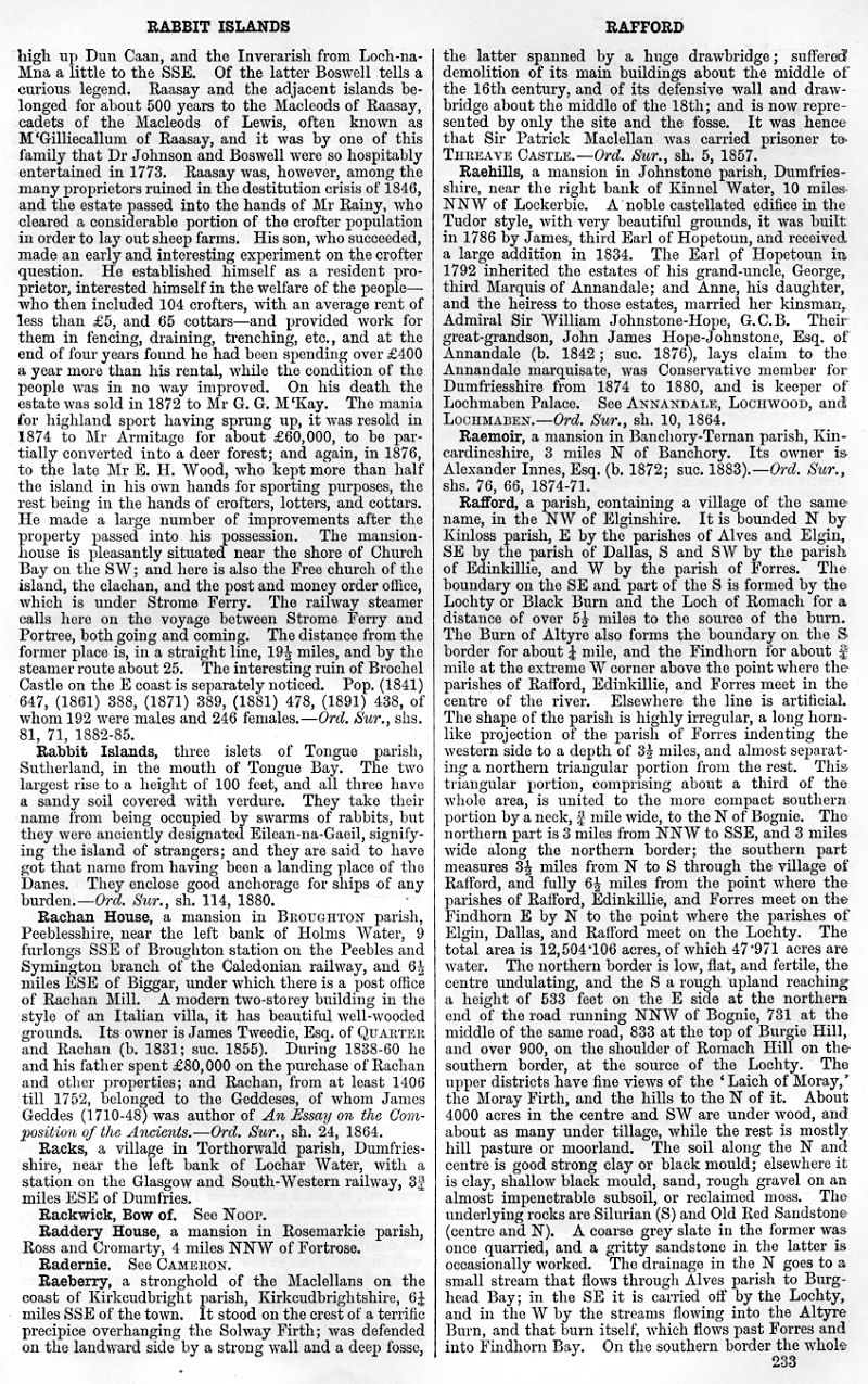 Rabbit Islands, Rachan House, Racks, Bow of Rackwick, Raddery House, Radernie, Raeberry, Raehills, Raemoir, Rafford