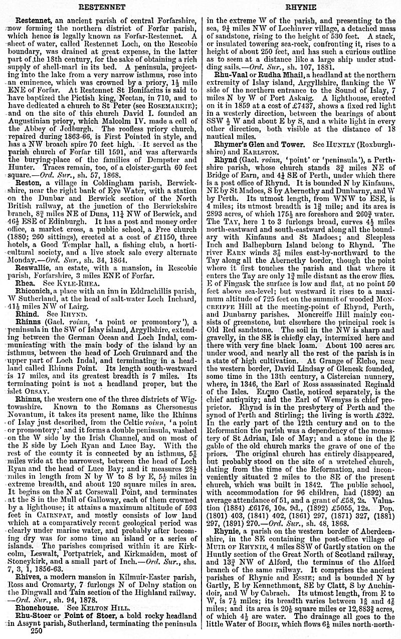 Rhind, Rhinns, Rhives, Rhonehouse, Rhu-Stoer or Point of Stoer, Rhu-Vaal