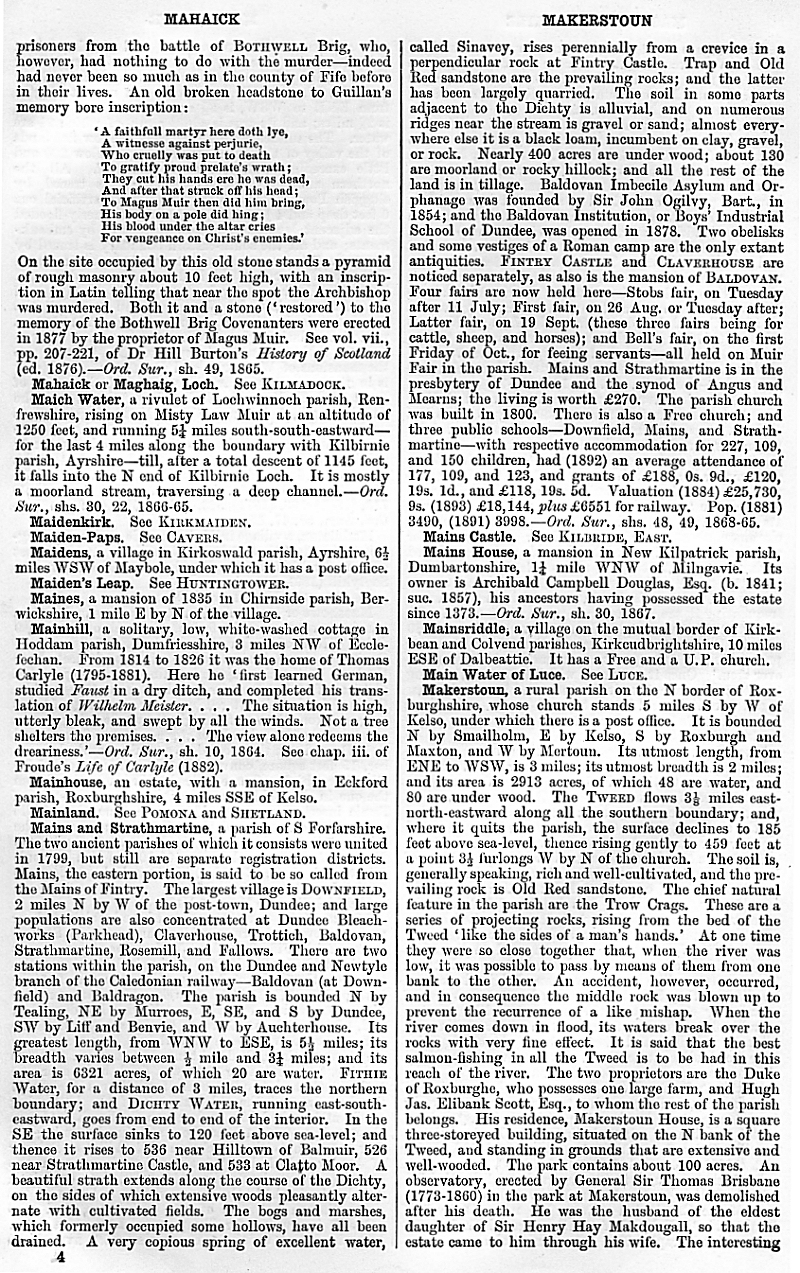 Mahaick or Maghaig, Maich Water, Maidenkirk, Maiden-Paps, Maidens, Maiden's Leap, Maines, Mainhill, Mainhouse, Mainland, Mains and Strathmartine, Mains Castle, Mains House, Mainsriddle, Main Water of Luce, Makerstoun