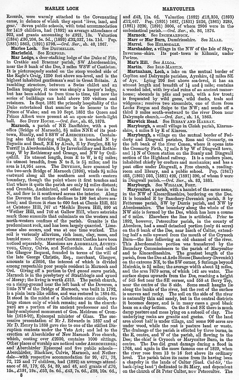 Marlee Loch, Marlefield, Mar Lodge, Marnoch, Marnock, Marr or Mar Burn, Marrel, Marshadder, Mar's Hill, Martin, Loch Martnaham, Marwick Head, Maryburgh, Maryculter