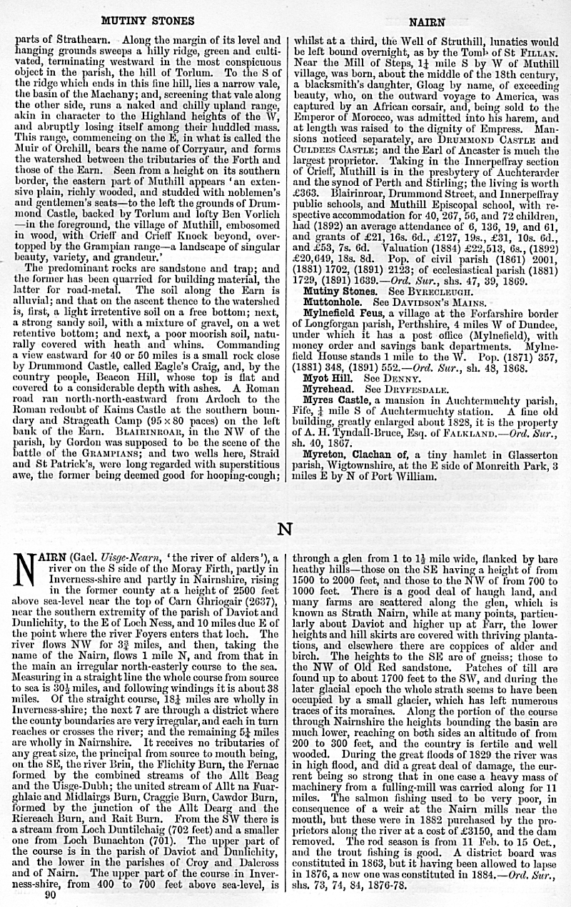 Mutiny Stones, Muttonhole, Mylnefield Feus, Myot Hill, Myrehead, Myres Castle, Clachan of Myreton, Nairn