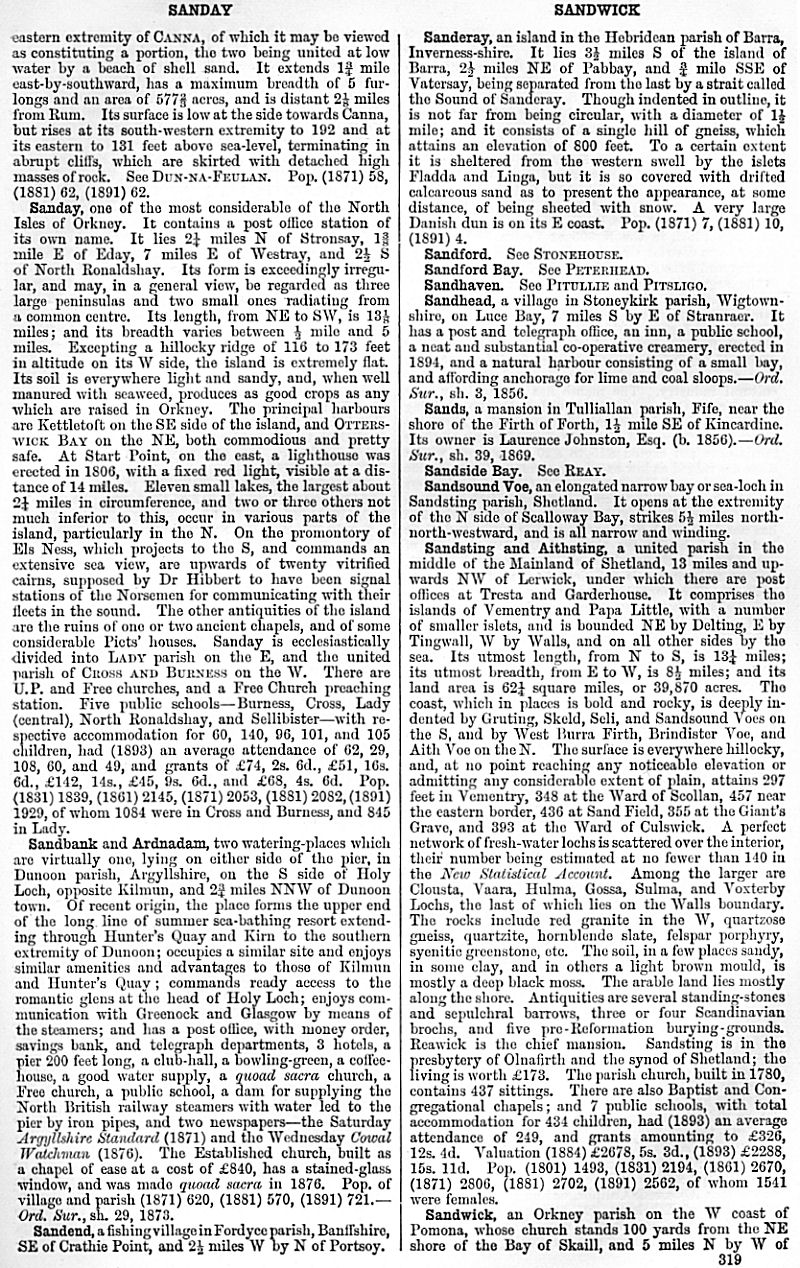 Sanday, Sandbank and Ardnadam, Sandend, Sanderay, Sandford, Sandford Bay, Sandhaven, Sandhead, Sands, Sandside Bay, Sandsound Voe, Sandsting and Aithsting, Sandwick