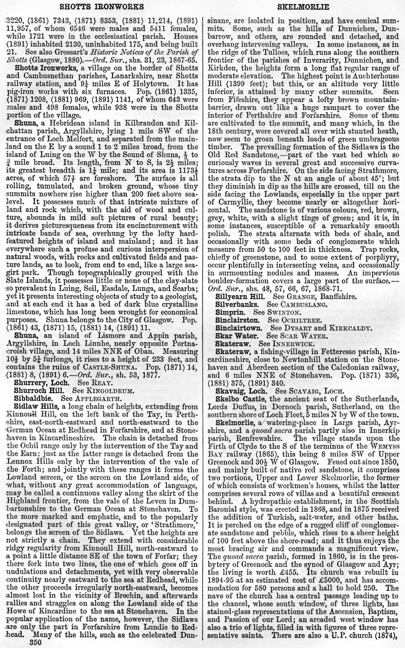 Shotts Ironworks, Shuna, Loch Shurrery, Shurroch Hill, Sibbaldbie, Sidlaw Hills, Sillyearn Hill, Silverbanks, Simprin, Sinclairston, Sinclairtown, Skar Water, Skateraw, Loch Skavaig, Skelbo Castle, Skelmorlie