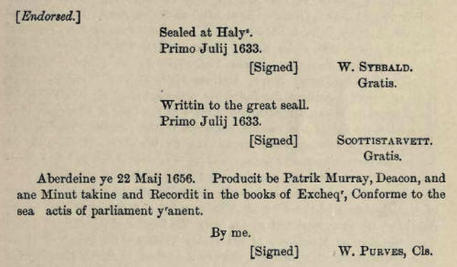 "IN WITNESS WHEREOF, to this my charter, written and subscribed with my hand, my authentic seal is appended, at Aberdeen, the sixth day of the month of June, in the year of our Lord, one thousand six hundred and thirty-three, before these witnesses, Mr. Thomas Melvill, Minister of the Word of God at Dyce; Mr. Walter Anderson, Minister at Kinellar; and Mr. William Ogstone, Minister at Kinnethmont."
