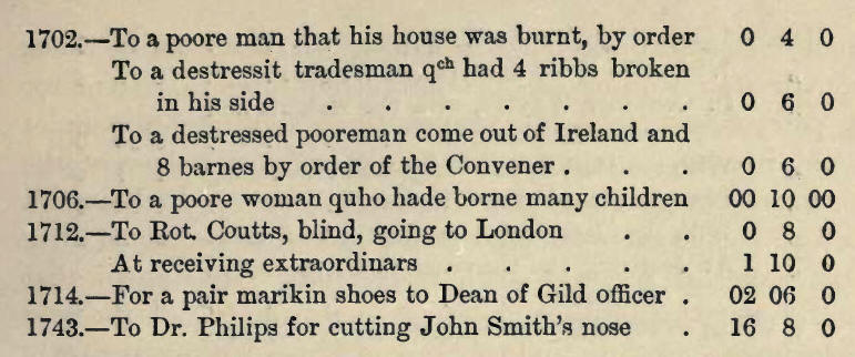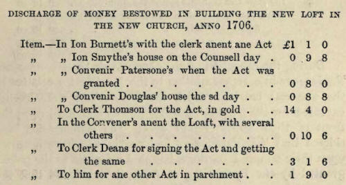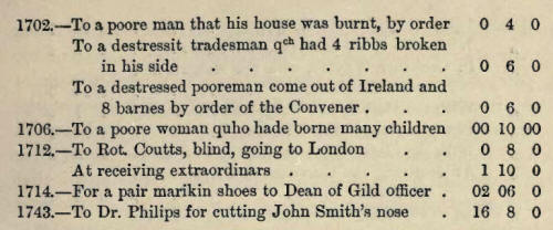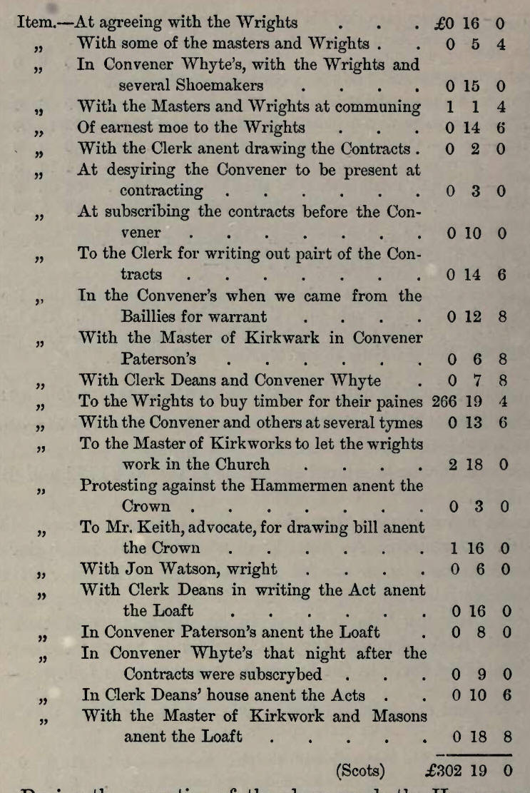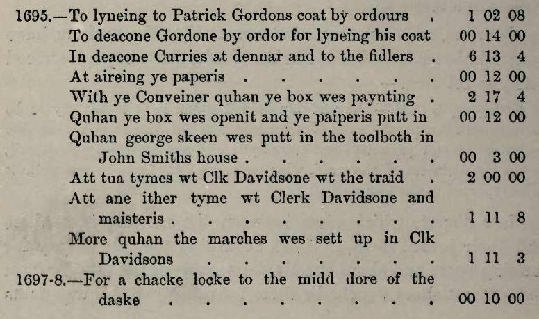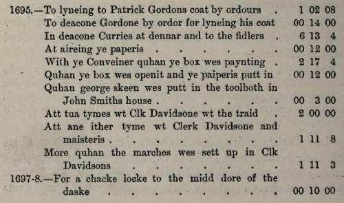 The account books of this Trade have been much better preserved than some of the others. From entries that occur in the earlier accounts it is evident that the old books had originally consisted of loose and unruled paper. One quire of paper was all that the Trade purchased at a time, and when filled up another was procured until a certain number had accumulated of sufficient bulk to form a book for binding. In 1694 one of these quires cost the Trade eight shillings Scots (eightpence sterling), and the cost of binding one pound four shillings Scots (two shillings sterling). The following are a few entries taken at random from the accounts :—