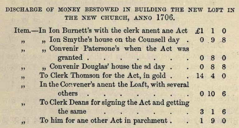 At a very early date the cordiners formed a connection with the church. As already mentioned, they had, prior to the Reformation, a special chaplain for their altar in St. Nicholas Kirk, and when the change of religion took place the craft fitted up "dasks," first in St. Nicholas, and then in Trinity Kirk. In 1741 they fitted up a new "dask," the cost of which is set forth in the boxmaster's accounts as follows :—