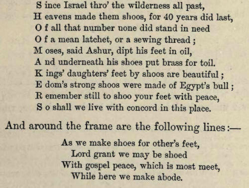 In a dispute which arose between the master shoemakers and their journeymen, in 1668, regarding the rate of pay for making boots and shoes, the Magistrates fixed the rate for "ilk pair. of best shoes. wrocht be them for men, fyve shillings Scots movie. Item, the second sort of men's shoes wrocht be them, ilk pair four shilling sex pennies money foresaid. Item, for ilk pair of best shoes for women, three shilling sex pennies money foresaid. Item, for ilk pair of weemen's shoes of the third sort, two shilling sex pennies money foresaid. Being all good and sufficient work, and which are all to be payed after completeina of the said work respectivlie. And anent that part of the supplicatione relating to restraining of the said journeymen mending and cobbling of shoes within ther owin houss, statutes and ordains that the said journeymen sail begine to ther work with ther imployers at sex houres in the morning and continue untill sex houres in the afternoon, usual and convenient tyme being allowit to them at nyne and twelve houres in the forenoon for refreshment."—Council Register, vol. lv., p. 107.