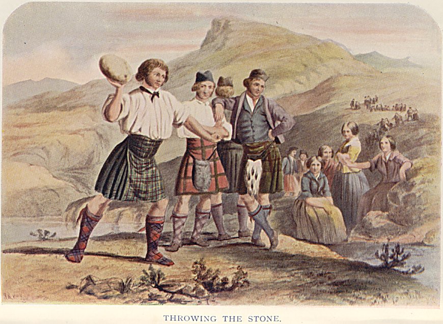 The Quinquertium, or five principal games at the Olympian festival were running, leaping, wrestling, throwing the javelin and quoits. Among the Highlanders, are racing, leaping, the running leap, much practised for its usefulness, wrestling, club and foot ball, tossing the caber, throwing the hammer, putting or throwing the stone, lifting a heavy stone, contests in swimming and many other feats of sheer strength and agility. The weight of the stone, called clach-neart or the stone of strength, which was to be lifted from the ground, was sometimes very great, and it was frequently placed near the church and sometimes in the Kirkyard, that the men might exercise their ‘vis inertia’ after the conclusion of religious service. One of this sort, named the Puterach, remains near the Kirk of Balquhider in Perthshire, which the strongest may boast having raised from the ground, breast high, which is the trial, and he is accounted a muscular man who can do so. Clach-cuid-fir was a stone of two hundred pounds weight and upwards, which was to be lifted from the ground and placed on another four feet high at least, and the youth who could perform this feat was forthwith reckoned a man.