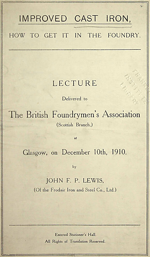 Of the many problems with which the ironfounder of to-day is faced perhaps the most important, and certainly the most interesting, is this: Can the quality of Cast Iron be improved to an extent sufficiently to raise its value and extend its function in the eyes of the mechanical engineer? 1 claim that the answer to this question is: Yes. 1 want to show that this question has proper warrant for its introduction into the deliberations of this Association; that touching the interests of the ironfounding industry it is a useful and even a vital question.