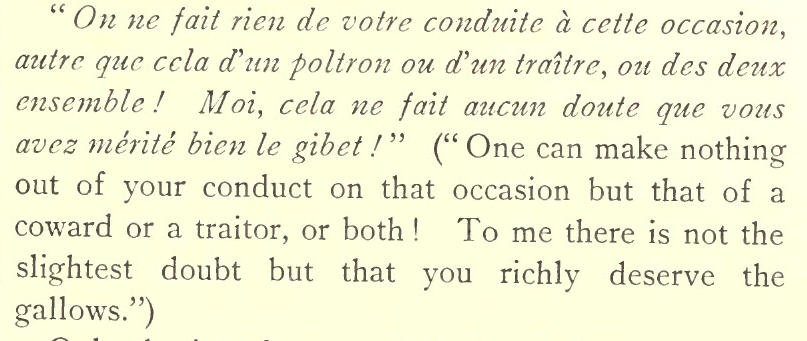 He was loathed by the crew of the Richard, who laid the death of many of their bravest comrades to his cowardly broadsides from the Alliance. Lieutenant Dick Dale had publicly insulted him in a coffee house at the Fielder, where Dale, who was only wounded a few days before and still limping badly, with his usual impetuosity tried to force a public quarrel on Landais, denouncing his behaviour in the Alliance; and in order that there might be no mistake in Landais's mind about his meaning, he expressed himself in Landais's own tongue, saying to him, among other things-