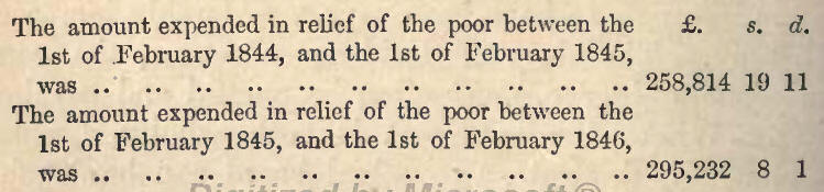 The Scottish Poor Law, we have seen, excluded able-bodied persons, that is in fact all the class of labourers, from participating in its benefits, or availing themselves of its protection in seasons like the present. It is true that famine, or a failure in the usual supply of food, is an event so far exceptional as scarcely to admit of being provided against by any description of Poor Law; but like other visitations it has its degrees of severity, and the sufferers under it have their different claims for sympathy and assistance. To exclude formally and entirely, whatever might be the circumstances, any one class or section of the people, whilst all requisite support is furnished to another section, does not seem to be consistent with justice, and can hardly be defended on the score of policy.