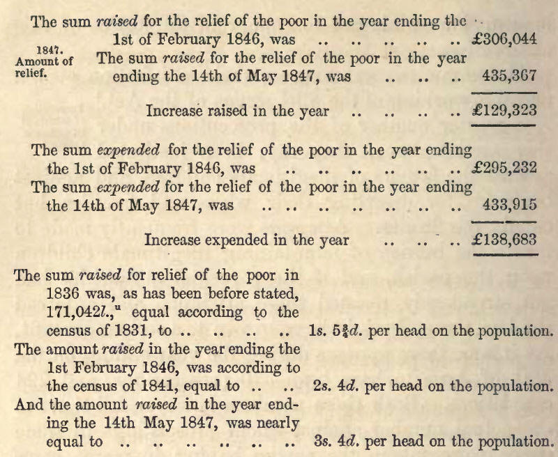In order to secure uniformity in the returns connected with the relief of the poor, which is so essential for affording accurate means of comparison, the commissioners issued minute regulations on the subject, and directed that the returns should be made up at Whitsunday, or the 15th of May in each year. The following statement will therefore be for the year ending on the 14th of May 1847, the interval between the 1st of February and the 15th of May 1846 being on this occasion altogether omitted:-