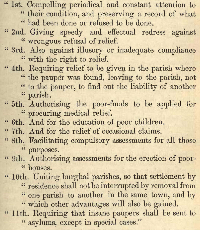 The Act, of which the foregoing is a comprehensive summary, contains many important provisions, and no doubt goes far to remove some of the uncertainties, and to supply several of the deficiencies, which existed under the old Scottish law with regard to the relief of the poor. By establishing regularly constituted parochial boards of management, and a board of general supervision, a machinery is moreover created competent to the discharge of all the duties imposed by the Act, and of still more extensive duties should such hereafter be required; whilst the power of levying assessments, and of combining parishes for the erection of poorhouses and providing medical relief, together with the appointment of inspectors, and the more certain provision for relief of the lunatic casual and unsettled poor, and for the purpose of education, are all exceedingly valuable additions to the former system, and cannot fail of being productive of much benefit.
