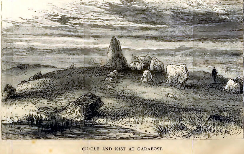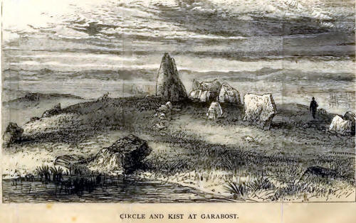 The Menhir and Kist, near Garabost, surrounded by a fosse and stone circle, are evidently of purely pagan origin. The stones have been originally very large, and the centre kist has been opened in search of treasure. On the low hill opposite is a large menhir known as the “Clach Stein,” the Gaelic having been prefixed to the original Norse.