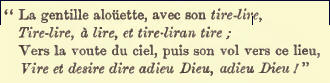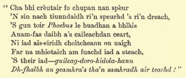The last line, if rapidly repeated with the proper beat and intonation, will be found a really very successful imitation of the concluding notes of the lark's well-known song. Many of our readers will remember that the North Uist bard, Ian Mac Codrum, in his Smeorach Chlann-Domhnuill, manages very happily to imitate the smeorach or song-thrusli's notes in the burden or chorus ; while Alexander Macdonald—Mac Mhaighstir Alasdair—very naturally falls, like the French poet, into an imitation of the wild-bird music of the woods and groves in a stanza that may be quoted not inappropriately at this season :—