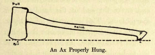 If necessary to bring this about you will, of course, cut off a little from the back of the helve until the ax hangs properly. Be very careful to see that the bit of the ax comes in direct line with the helve.