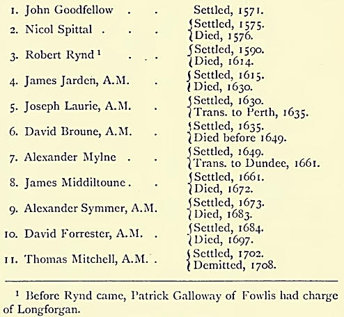 1. John Goodefellow. Settled, 1571.—Prior to the Reformation in 1560, he was a member of the Chapter of St. Andrews. He may be the same as John Gudefallo, who was minister of Benholme. He was a friend of John Spots-wood, Superintendent of Lothian. Spotswood " left to the poor of the pars of Calder-Comitis., xx merkis, and giffis to Johne Spotswood in Blakisling, and his bairns, xli of that in the hands of Johne Gudefellow, min. of Longforgan, for his help at the schulis." In Calder-wood's History, iii. p. 186, Johne Guidfallow, minister at Longforgunde, is named along with David Robertsone at Rossy.