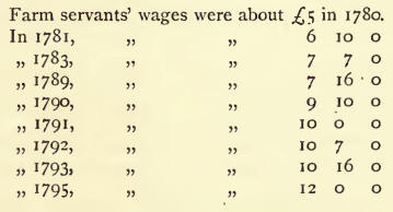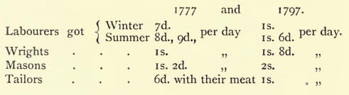 A short reference to harvesting will bring this sketch to a fitting close. At this time, the practice was to hire shearers for the whole harvest, which lasted generally about three weeks. Wages ran between 20s. and 30s. for men, and between 14s and 20s. for women. In 1780, the harvest cost in one farm in the parish 5s. per acre; in t781, 5s. 8d. ; 1782, 6s. ; 1783, 7s. 1 id. Before the century closed, it had gone as high as 10s. per acre.