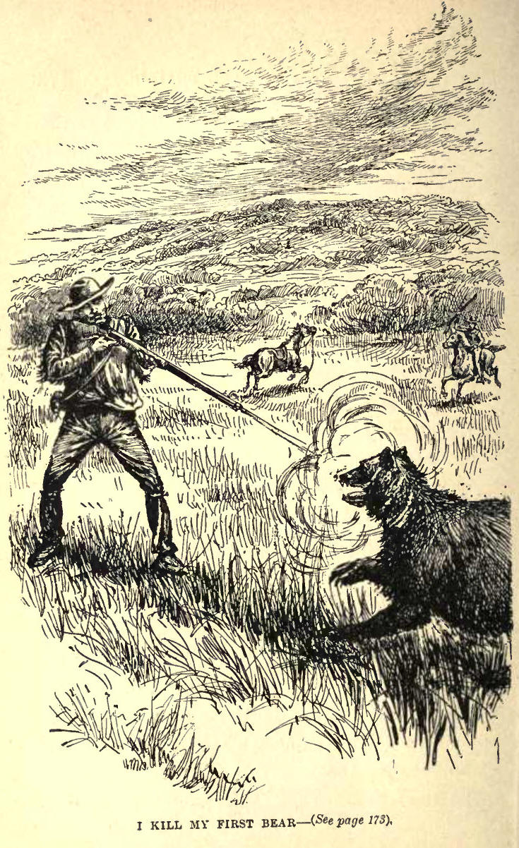 Just then I saw a lone tree standing on the plain right in the course the bear was taking, and it flashed upon me what to do. I will ride up between the bear and the tree, jump off, let the bear come close, and then if I miss him I will drop my gun and make for that tree. I felt I coud leave the bear in a fair run for that distance. We required the food, and I wanted to kill that bear. With all my heart I wished to do this, and now I was opposite, and my horse began to shy and jump; so I uncoiled my lariat and let it drag, to make it easier to catch my horse, and, jumping from his back, I let him go; and now the bear, seeing me between him and the brush, showed the white of his teeth, put back his ears, and came at me straight.
