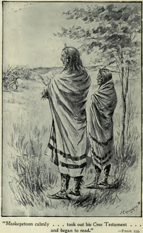 It was well known in Maskepetoon's camp that the Blackfeet were in strength not more than one hundred miles south, and that the Bloods and Piegans were within easy distance beyond them; but Maskepetoon had great faith in his record with these people, and at the head of a small party he set out to patch up a peace, even if it should be but short-lived. While on this expedition his little party was charged upon by a strong body of Blackfeet who were coming north on the war-path. Such was their number and the vigor and dash of their charge that, as they drew near, Maskepetoon's little company fled, all but himself and his grandson, a boy some fifteen or sixteen years of age. These alone stood the wild onslaught of their enemies. The veteran chief and the noble boy of like heroic blood stood like statues "when all but they had fled." Maskepetoon calmly put his hand in his bosom and took out his Cree Testament, and then coolly fixing on his glasses, opened and began to read. The grandson, in relating to us the incident afterwards, said, "There was no tremor in his voice; it was as if grandfather was reading to us in the quiet of his own tent."