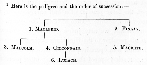 The law of succession was according to the law which is called, in Ireland at least, the law of Tanistry — a system which depended upon a descent from a common ancestor, but which selected the man come to years fit for war and council, instead of the infant son or grandson of the last chief, to manage the affairs of the tribe, and who was recognised as the successor, under the name of Tanist, even during the life of the chief. To take one instance, from the ancient history of Moray, a district which long continued to pay respect to its ancestral Maormors. Maolbride is the first known Maormor; he left a son Malcolm, but the office or dignity did not descend upon him, but went to Finlay the brother of Maolbride. After Finlay's death, Malcolm at length succeeded to his father's place ; he was succeeded in turn by his brother Gil-congain. Gilcongain was succeeded by Macbeth, the son of Finlay; and after Macbeth had lost his local dignity and his crown with his life, he was succeeded in the maormorship by Lulach, the son of Gilcongain; the maormorship thus passing, in as many generations, to the brother, nephew, brother, nephew, and cousin-german.