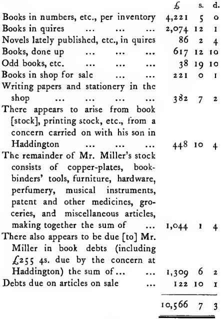 In the circular summoning the meeting Miller ascribes his embarrassments to “the long-continued pressure of a heavy book-stock rendered unsaleable for a length of time by the peculiarly distressed condition of the country,” and states his expectation to pay his debts in full if time were allowed him. His creditors were chiefly men engaged in the publishing trade—William Gracie of Berwick-upon-Tweed, William Caddel & Co.,