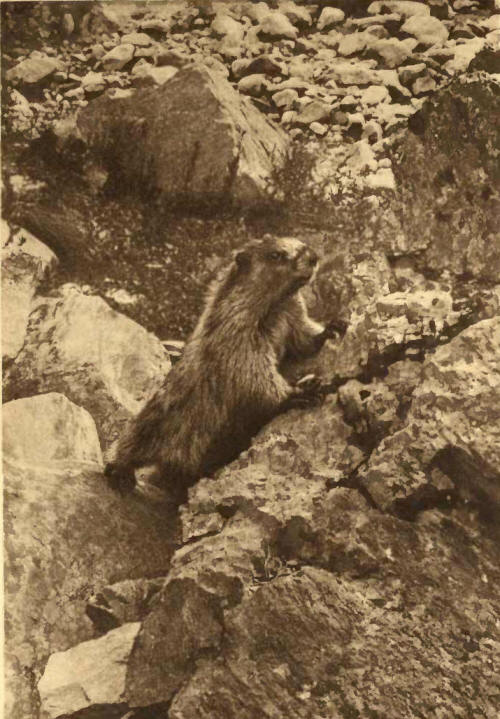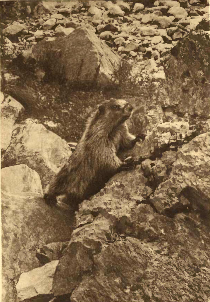 A brown, speckled marmot, one of Le Claire's friends, was getting ready for winter. The entrance to his burrow was a little to one side of the cabin door. A well-worn trail led to it through the grass and another to that of his companion, fifty feet away. He was a most amusing pet, always on hand at meal times for bread-crumbs and bits of bacon-rind, came when called, answering in a shrill whistle, moving like a squirrel with quick, nervous impulses, jerking his short, flat tail. His fur clothing was neat and clean, fairly shining in the wintry light. The snowy weather that morning must have called winter to mind; for as soon as he got his breakfast, he ran to a tuft of dry grass, chewed it into fuzzy mouthfuls, and carried it to his nest, coming and going with admirable industry, forecast, and confidence.