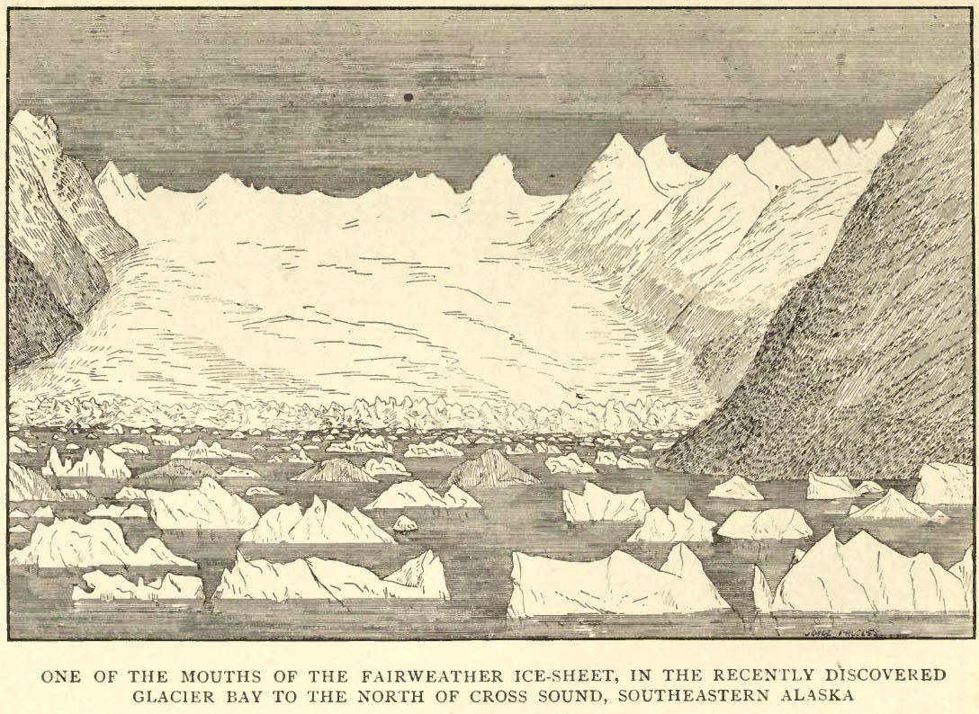 On through British Columbia and southeastern Alaska the broad sustained mountain chain extending along the coast is generally glacier-bearing. The upper branches of nearly every one of the main canons are occupied by glaciers, which gradually increase in size and descend lower until the lofty region between Mount Fairweather and Mount St. Elias is reached, where a considerable number discharge into the waters of the ocean.