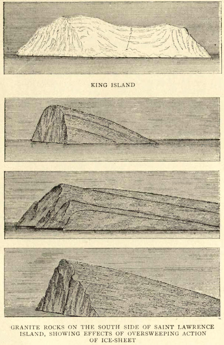 Near the middle of the island there is a low gap, where the width is only about half a mile, and the height of the summit of this portion of the water-shed between the two sides is only about two hundred and fifty feet. The entire island as far as seen is a mass of granite, with the exception of a patch of metamorphic slates near the middle, which no doubt owes its existence, with so considerable a height, to the superior resistance it offered to the degrading action of ice, traces of which are presented in the general moutonnée form of the island, and in the smooth parallel ridges and valleys trending north and south. These evidently have not been determined as to size, form, position, or the direction of their trends by subsidences, upheavals, foldings, or any structural peculiarity of the rocks in which they have been eroded, but simply by the mechanical force of an oversweeping ice-sheet.