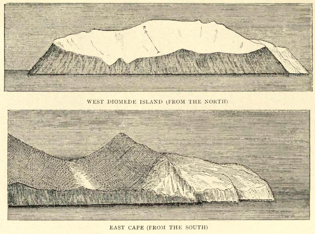 The two Diomede Islands and Fairway Rock are mostly residual masses of granite brought into relief and separated from one another and from the general mass of the continent, by the action of ice in removing the missing material, while the islands remain because of superior resistance offered to the universal degrading force. That they are remnants of a once continuous land now separated by Bering Strait is indicated by the relative condition of the sides of the islands and of the contiguous shoulders of the continents, East Cape and Cape Prince of Wales, while the general configuration of the islands shows that they have been subjected to a glaciation of the most comprehensive kind, leaving them as roches moutonnées on a grand scale.