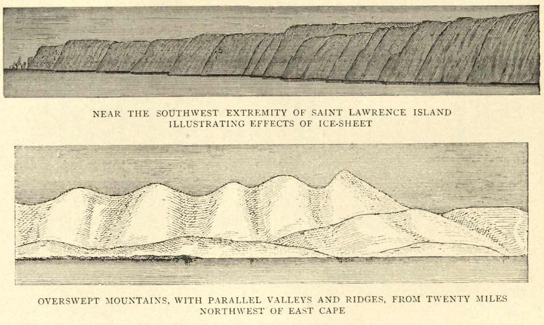 As to the thickness attained by the ice-sheet over the regions that we have been examining during the period of greatest glacial development, we have seen that it passed heavily over the islands of Bering Sea and the adjacent mountains on either side, especially at East Cape and Cape Prince of Wales, at a height of twenty-five hundred feet or more above the bottom of Bering Sea and Strait, the average depth of water here being about a hundred and fifty feet. And though the lowest portion of the land beneath the ice may have been degraded to a considerable depth subsequent to the time when these highest portions were left bare, on the other hand the level of the ice must have been considerably higher than the summits over which it passed, inasmuch as they give evidence of having been heavily abraded. It appears, therefore, that the thickness of the general northern ice-sheet throughout a considerable portion of its history was not less than twenty-five hundred feet, and probably more, over the northern portion of the region now covered by Bering Sea and part of the Arctic Ocean.