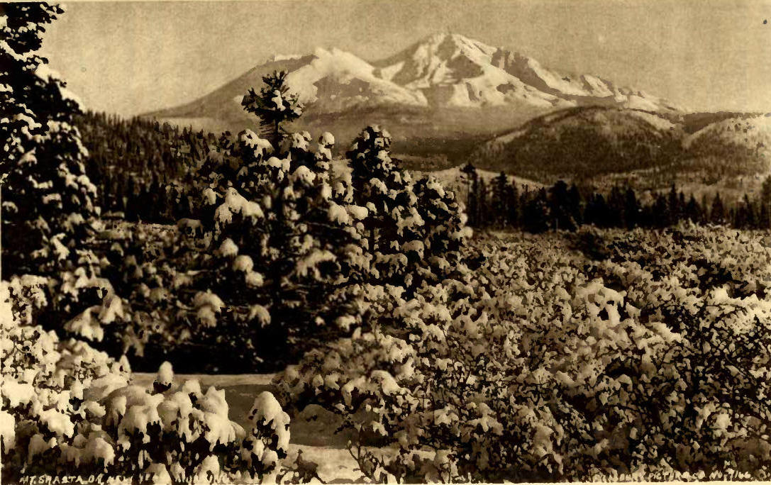 TOWARD the end of summer, after a light, open winter, one may reach the summit of Mount Shasta without passing over much snow, by keeping on the crest of a long narrow ridge, mostly bare, that extends from near the camp-ground at the timber-line. But on my first excursion to the summit the whole mountain, down to its low swelling base, was smoothly laden with loose fresh snow, presenting a most glorious mass of winter mountain scenery, in the midst of which I scrambled and reveled or lay snugly snowbound, enjoying the fertile clouds and the snow-bloom in all their growing, drifting grandeur.