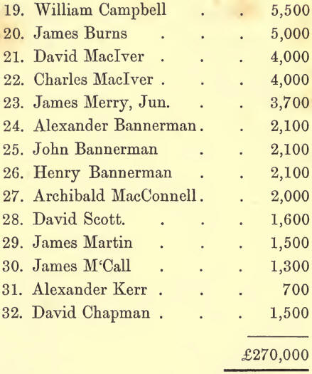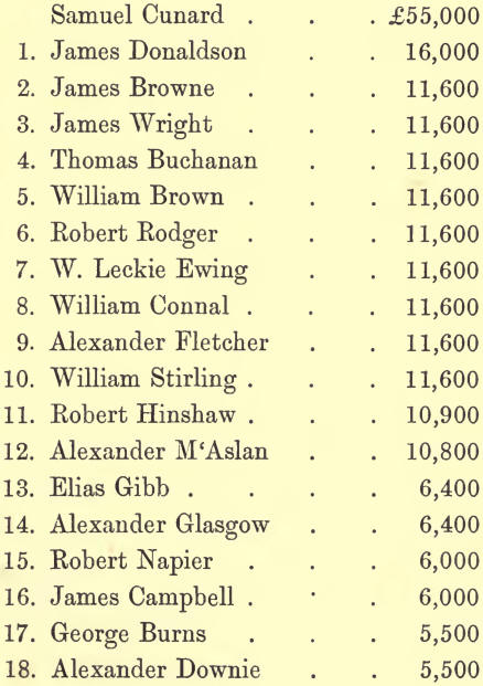 It will be observed Mr Cunard had by far the largest holding in the Company, and the other shares were divided pretty equally between Mr Napier and his friends and Mr Burns and those whom he induced to join the enterprise. Though Mr Burns personally did not subscribe a great amount, he obtained through