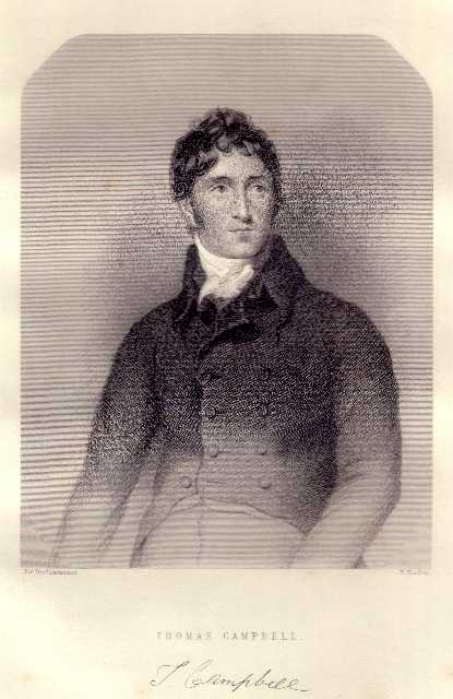 CAMPBELL, THOMAS, a distinguished poet, the most perfect lyrical writer of his time, was born at Glasgow on the 27rh of July, 1777. Alexander Campbell, the father of the poet, was the youngest of the three sons of the laird of Kirnan, and was born in 1710. He was educated for the mercantile profession, and early in life went to America, where he entered into business, and resided many years at Falmouth, in Virginia. There he had the pleasure of receiving his brother Archibald, on his first quitting Jamaica to settle in the United States, and there also, about ten years afterwards, he formed an intimate acquaintance with Daniel Campbell, a clansman, but no relation, with whom he returned to Glasgow, and there entered into partnership with him as Virginian traders, under the firm of Alexander and Daniel Campbell. For some years their business prospered, and both partners were highly esteemed as men of probity and experience. Daniel, the junior partner, had a sister named Margaret, whom Alexander took to be his wife, and she became the mother of the poet. They were married in the cathedral church of Glasgow on the 12th of January 1756. At this time Mrs. Campbell was about twenty, while her husband had reached the mature age of forty-five. They had eight sons and three daughters, and the poet, who was the youngest of the family, was born when his father had reached his 67th year, the age at which he himself died.