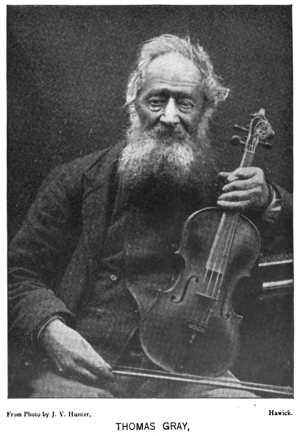 Thomas Gray was born in the Border town of Earlston, and never left it unless to go on his regular rounds with his pack and his fiddle, to dispose of his “ginghams" the quality of which was proverbial, and concerning which he could have honestly said, “I counsel thee to buy of me.” He was born early in the year 1794, and died from the result of an accident while on a visit to friends in 1884, at the age of ninety. With only the early education which the parish school of the day afforded, he managed by diligent application to cultivate his intellect to such an extent that he became in his own neighbourhood and far remote, famous for his learning and intimate knowledge of the leaders in literature. He possessed upwards of 2,000 books—many of them standard works, scarce bibles, dictionaries and commentaries—and not only possessed them but he knew and had mastered the contents of most of them. It is interesting to know that the sale of this library after his death brought many "bidders" from distant parts of the country, and some boasted that they had got prizes they had been unable to find elsewhere.