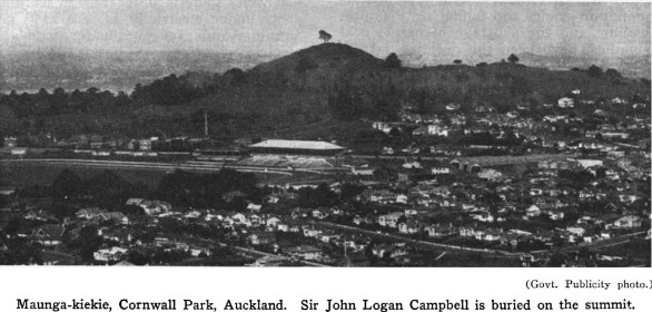 a quarter of a million pounds. But his benefactions to Auckland are not to be measured in mere cash values. The noble park, fair in the heart of greater Auckland, which he made over to the people in 1901, is a really priceless public endowment. It has several names. Totara-iahua is the sharp summit, the ancient tihi or citadel of the great chief Kiwi Tamaki; the hill is Maunga-kiekie (“Mount of the climbing plant Freycinetia Banksii”); the local popular name is One-Tree Hill, and at the donor's request it was renamed Cornwall Park in honour of the Royal visitors. But a more fitting name now would be Campbell Park, and that is what one would like to see it generally styled in the future. It is a very lovely place, this softly green and partly-wooded hill, rising in tier after tier of terraces and in curves shady with tall trees; a wonderful relic of Maori military engineering genius which made of this volcanic cone a fortress, with line after line of escarpments which in some places resemble great amphitheatres, round about the ancient craters. Campbell left a bequest of £5,000 to erect a great obelisk to the memory of the glory of the Maori race on the crest of the mountain, but what better memorial can there be than the hill itself? The fortifications so clearly traceable to-day extend about a hundred acres. This is only a small portion of the parklands that circle around the tree-crowned mountain top where the grand old man sleeps, for as is fitting he was laid to rest on the summit. There we may imagine his spirit lingers to keep watch over the plain of Tamaki-makau-rau. To him how well applies the epitaph linked with the name of Sir Christopher Wren, “Si monumentum quaeris, circumspice.” At the main entrance to the park there is a statue to his memory, but the park itself is his sufficient monument.