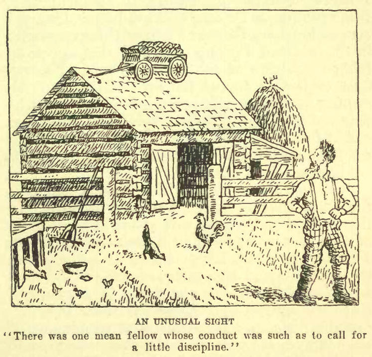 "For instance there was one mean and generally disagreeable fellow, whose conduct was such as to call for a little discipline. In those days they teamed grain to Port Hope, more than twenty miles distant, and loaded their wagons the night before so as to get an early start the next morning. This man had a wagon load of grain all ready to go to market. When he got up in the morning lie found the wagon, still loaded, astride the ridge of the barn. He may not have enjoyed the work of getting the wagon and bags down from the roof, but he was a better citizen afterwards.