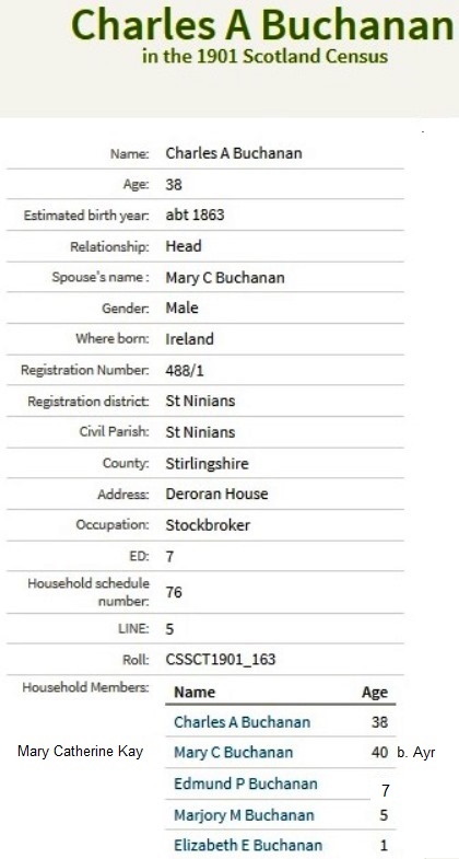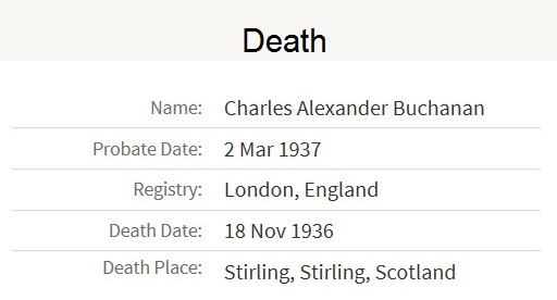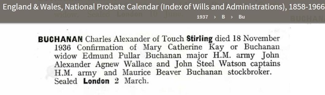 Edmund's father, Charles Alexander Buchanan, died in Stirling on the 18th of November, 1936, and his mother died in Surrey, England in December, 1943.