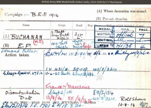 Edmund enlisted to fight in World War 1 and became a distinguished leader of men, as a Lieutenant/ Captain/ Major, winning, among other medals, the Military Cross for vital patrol work that brought important strategic information to his Commanding Officer. Thereafter, although he suffered severe chest wounds at the Battle of Loos, he was twice Mentioned In Dispatches. He then also served in Salonika.