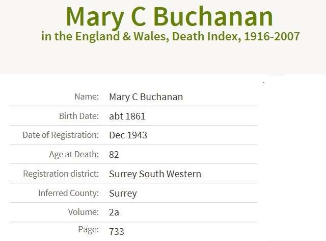 The widow of Colonel Buchanan, Doreen Marguerita (Bury) Buchanan, died in Stirling, Scotland in 1986 aged 85 years.