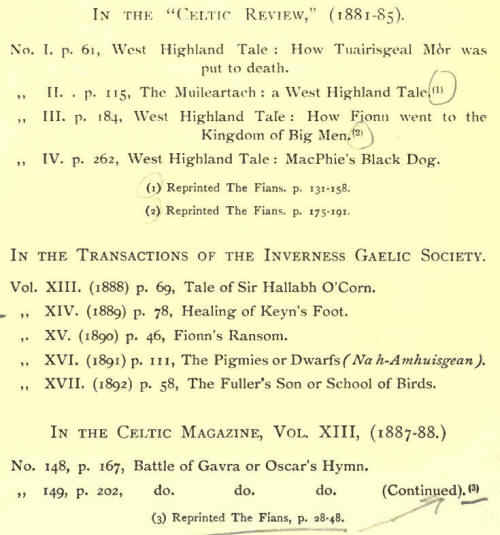 To Campbell of Islay and the faithful fellow-workers whom he knew how to inspire and organise, falls the chief share in this work, belongs the chief honour of its successful achievement. The publication of the Popular Tales of the West Highlands was epoch-making, not only in the general study of folk-lore, but specially for the appreciation and intelligence of Gaelic myth and romance. No higher praise can be given to John Gregorson Campbell than that his folk-lore work is full of the same uncompromising fidelity to popular utterance, the same quick intuition into, and sympathetic grasp of popular imagination as Islay's. His published work has indeed a somewhat wider range than that of Leabhar na Feinne and the Popular Tales of the West Highlands, as it deals also with those semi-historic traditions, the nearest equivalent the literature of these islands can show to the Icelandic family sagas, which Islay excluded from the two collections he issued. The following is a complete list, so far as can be ascertained, of the published writings of John Gregorson Campbell, in so far as they relate to the legendary romance, history and folk-lore of Gaelic Scotland.