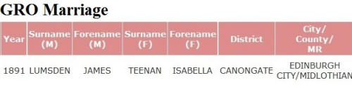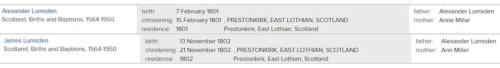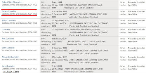 The births of James Lumsden's father, Alexander, his uncle, James, with