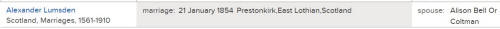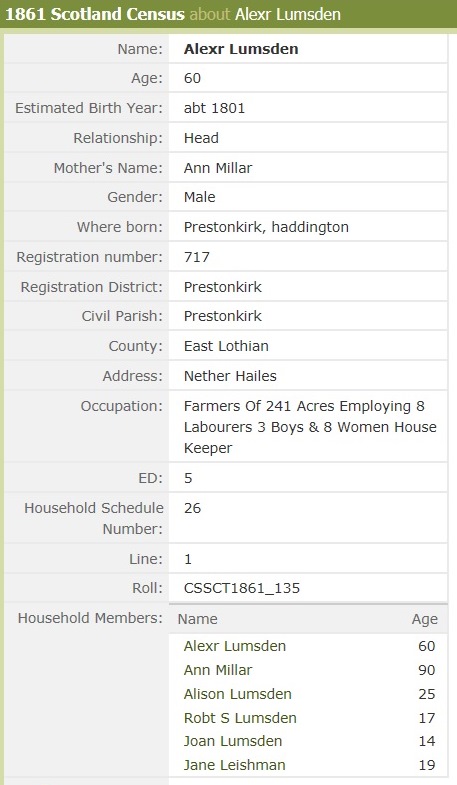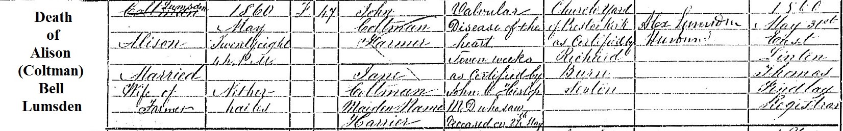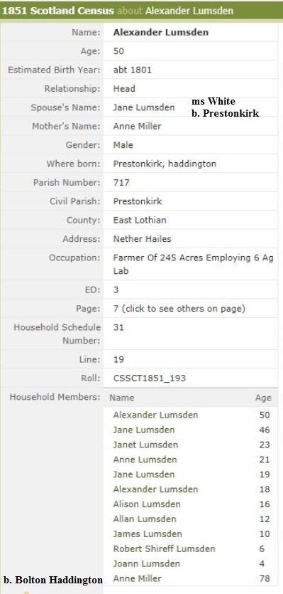 Lumsden, born 1801. Alexander's 2nd wife was a widow Alison (Coltman) Bell,