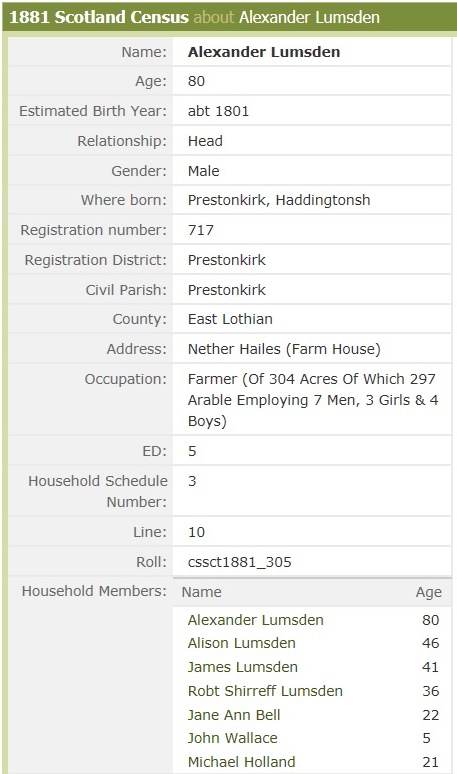 reappear at Nether Hailes in the 1880s, as shown by the 1881 Census, and his