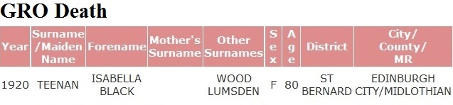 age of 51) the widow, Isabella Black (Wood) Teenan, of Joseph Teenan,