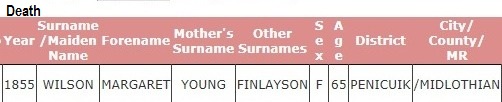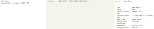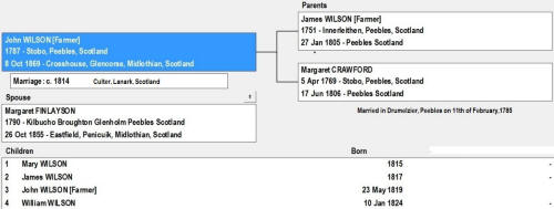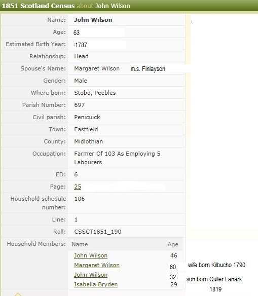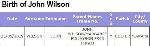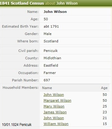 Now, in the 1841 Census we see John, b.1819, living with parents John Wilson and Margaret Finlayson et al.