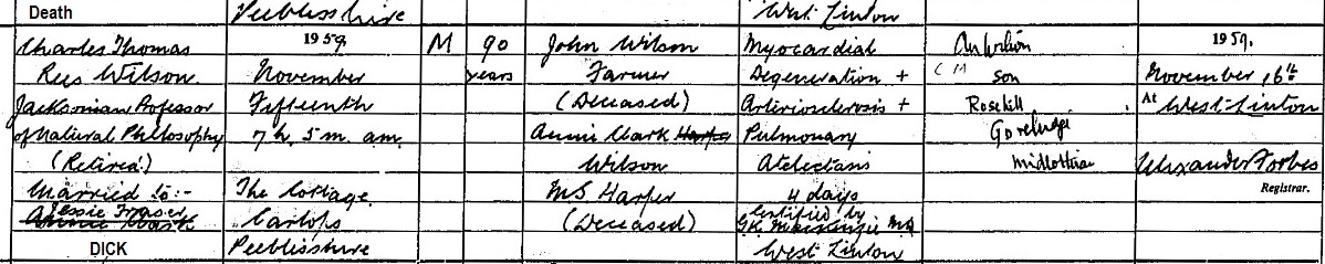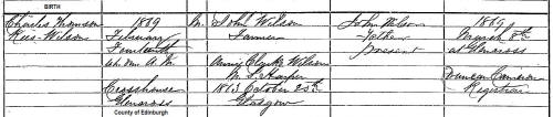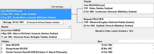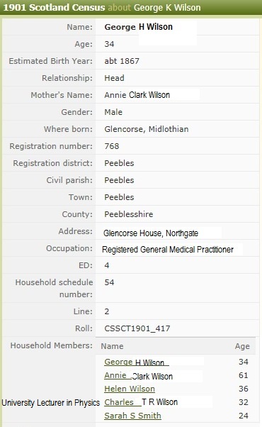 Ancestral data relating to Charles' paternal Wilson line and their spouses, authenticated by Birth, Marriage, Death and Census registration images, reveal that his roots from the mid-1700s lay in Peebles-shire, and then in Lanarkshire, Renfrewshire and Midlothian in the 1800s before his own birth in Glencorse, Midlothian in 1869 from his father's second marriage . After his father's death in 1872, Charles, along with some of his siblings, and some of his step-siblings, moved at least temporarily to Manchester with his mother Annie Clark (Harper) Wilson, to live with, or near, her Harper parents and some of her siblings who were still involved in shipping business enterprises. Charles' school education was so successful in Manchester at Owens College, that he went up to Cambridge University aged 19 years in 1888. By at least 1891, Charles' mother was back 'living on her own means' in Penicuik, Scotland, and Charles appears with her there, probably on Easter vacation from Cambridge, in the 1891 Census, and then again in the 1901 Census at his medical practitioner brother Doctor George Harper Wilson's home at Glencorse House, Northgate, Peebles.